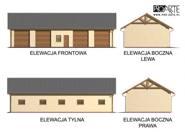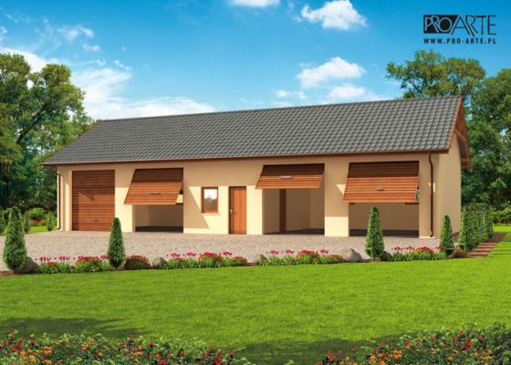 Budynek gospodarczy, wolnostojący. Projekt składa się z części architektonicznej, konstrukcyjnej i wewnętrznej instalacji elektrycznej. W projekcie załączone są podstawowe zestawienie stali, drewna i stolarki okienno-drzwiowej. Do projektu dołączamy bezpłatną zgodę na wprowadzenie zmian, oświadczenie projektantów o wykonaniu projektu zgodnie z obowiązującymi normami i przepisami oraz kserokopie uprawnień projektantów wraz z aktualnym wpisem do izby. W przypadku zamówienia projektu w technologii lekkiej, drewnianej konstrukcji szkieletowej, powierzchnia użytkowa budynku jest o około 7% większa.