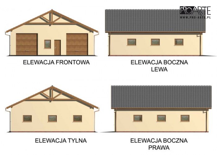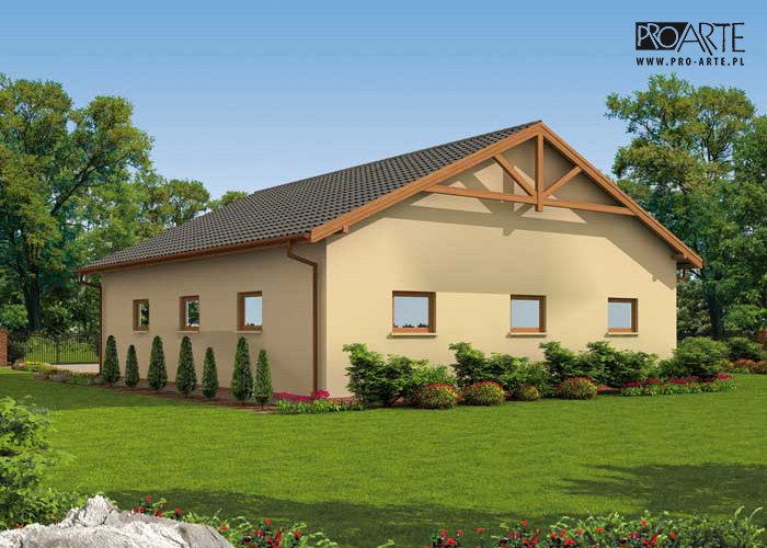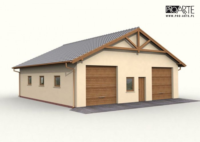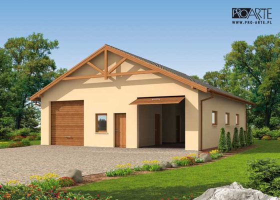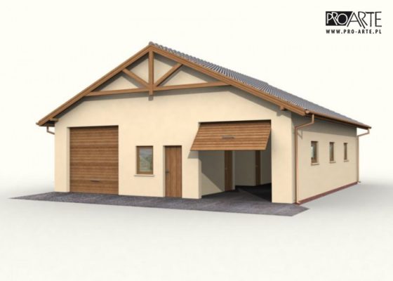 Budynek gospodarczy, wolnostojący. Projekt budynku składa się z 6 egzemplarzy, a w tym 3 tomów części architektoniczno-budowlanej oraz 3 technicznej. W projekcie załączone są podstawowe zestawienie stali, drewna i stolarki okienno-drzwiowej. Do projektu dołączamy bezpłatną zgodę na wprowadzenie zmian, oświadczenie projektantów o wykonaniu projektu zgodnie z obowiązującymi normami i przepisami oraz kserokopie uprawnień projektantów wraz z aktualnym wpisem do izby. W przypadku zamówienia projektu w technologii lekkiej, drewnianej konstrukcji szkieletowej, powierzchnia użytkowa budynku jest o około 7% większa.