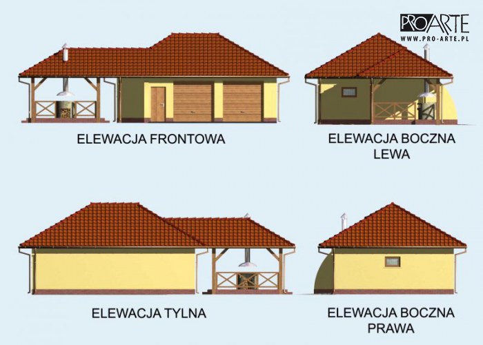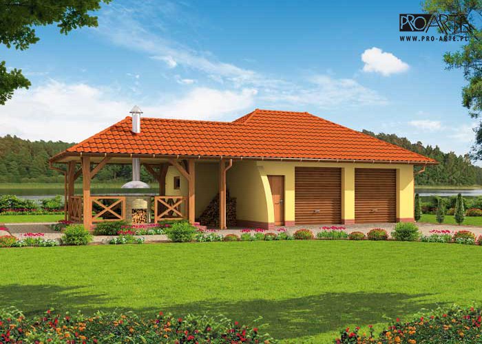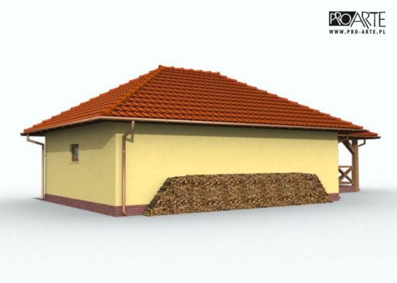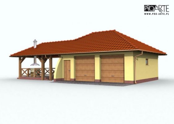 Budynek gospodarczy, wolnostojący. Projekt składa się z części architektonicznej, konstrukcyjnej i wewnętrznej instalacji elektrycznej. W projekcie załączone są podstawowe zestawienie stali, drewna i stolarki okienno-drzwiowej. Do projektu dołączamy bezpłatną zgodę na wprowadzenie zmian, oświadczenie projektantów o wykonaniu projektu zgodnie z obowiązującymi normami i przepisami oraz kserokopie uprawnień projektantów wraz z aktualnym wpisem do izby. W przypadku zamówienia projektu w technologii lekkiej, drewnianej konstrukcji szkieletowej, powierzchnia użytkowa budynku jest o około 7% większa.