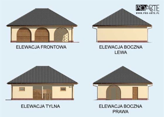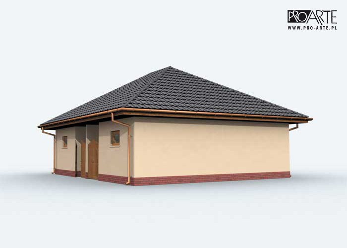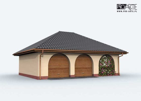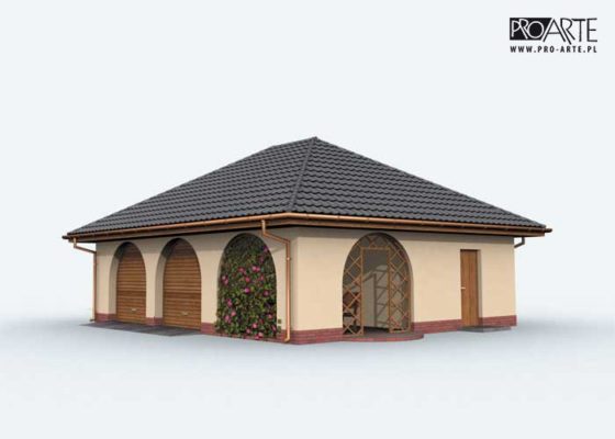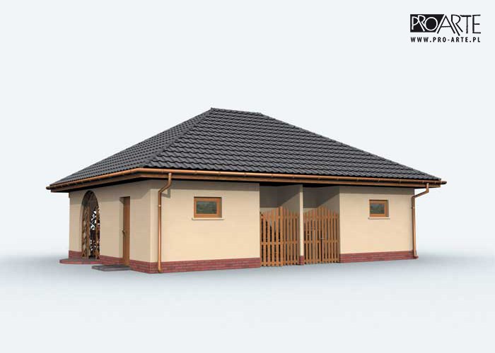 Budynek gospodarczy, wolnostojący. Projekt składa się z części architektonicznej, konstrukcyjnej i wewnętrznej instalacji elektrycznej. W projekcie załączone są podstawowe zestawienie stali, drewna i stolarki okienno-drzwiowej. Do projektu dołączamy bezpłatną zgodę na wprowadzenie zmian, oświadczenie projektantów o wykonaniu projektu zgodnie z obowiązującymi normami i przepisami oraz kserokopie uprawnień projektantów wraz z aktualnym wpisem do izby. W przypadku zamówienia projektu w technologii lekkiej, drewnianej konstrukcji szkieletowej, powierzchnia użytkowa budynku jest o około 7% większa.