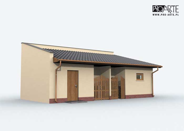 Budynek gospodarczy, wolnostojący. Projekt składa się z części architektonicznej, konstrukcyjnej i wewnętrznej instalacji elektrycznej. W projekcie załączone są podstawowe zestawienie stali, drewna i stolarki okienno-drzwiowej. Do projektu dołączamy bezpłatną zgodę na wprowadzenie zmian, oświadczenie projektantów o wykonaniu projektu zgodnie z obowiązującymi normami i przepisami oraz kserokopie uprawnień projektantów wraz z aktualnym wpisem do izby. W przypadku zamówienia projektu w technologii lekkiej, drewnianej konstrukcji szkieletowej, powierzchnia użytkowa budynku jest o około 7% większa.