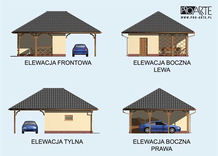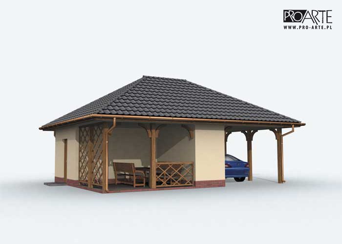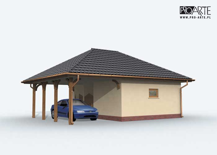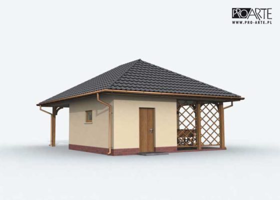 Budynek gospodarczy, wolnostojący. Projekt składa się z części architektonicznej, konstrukcyjnej i wewnętrznej instalacji elektrycznej. W projekcie załączone są podstawowe zestawienie stali, drewna i stolarki okienno-drzwiowej. Do projektu dołączamy bezpłatną zgodę na wprowadzenie zmian, oświadczenie projektantów o wykonaniu projektu zgodnie z obowiązującymi normami i przepisami oraz kserokopie uprawnień projektantów wraz z aktualnym wpisem do izby. W przypadku zamówienia projektu w technologii lekkiej, drewnianej konstrukcji szkieletowej, powierzchnia użytkowa budynku jest o około 7% większa.
