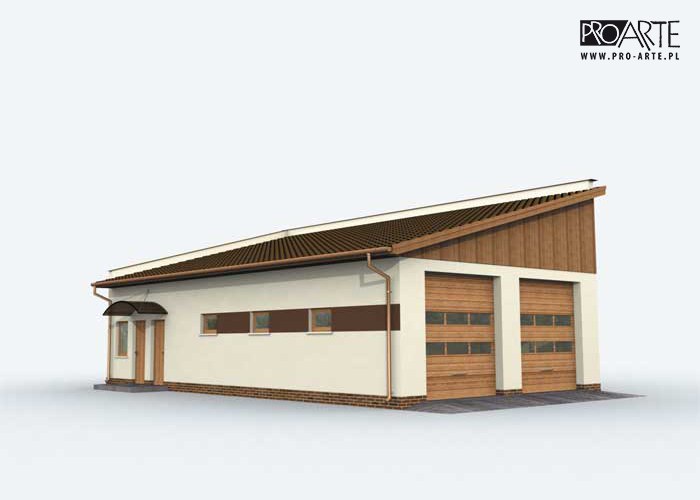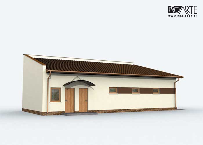 Budynek gospodarczy, wolnostojący. Projekt składa się z części architektonicznej, konstrukcyjnej i wewnętrznej instalacji elektrycznej. W projekcie załączone są podstawowe zestawienie stali, drewna i stolarki okienno-drzwiowej. Do projektu dołączamy bezpłatną zgodę na wprowadzenie zmian, oświadczenie projektantów o wykonaniu projektu zgodnie z obowiązującymi normami i przepisami oraz kserokopie uprawnień projektantów wraz z aktualnym wpisem do izby. W przypadku zamówienia projektu w technologii lekkiej, drewnianej konstrukcji szkieletowej, powierzchnia użytkowa budynku jest o około 7% większa.
