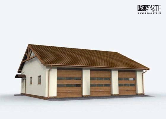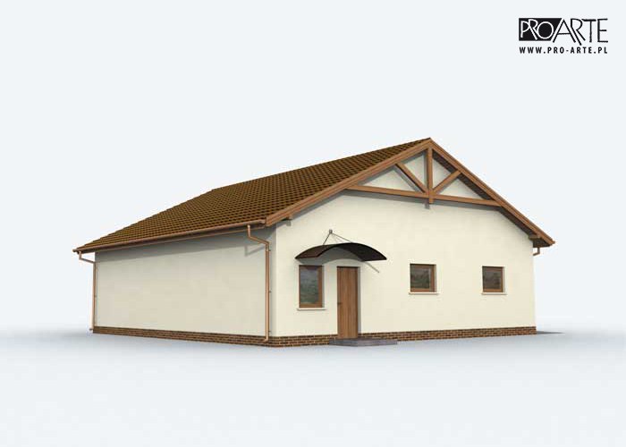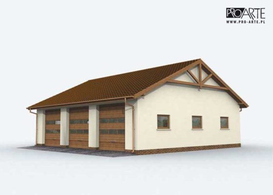 Budynek gospodarczy, wolnostojący. Projekt składa się z części architektonicznej, konstrukcyjnej i wewnętrznej instalacji elektrycznej. W projekcie załączone są podstawowe zestawienie stali, drewna i stolarki okienno-drzwiowej. Do projektu dołączamy bezpłatną zgodę na wprowadzenie zmian, oświadczenie projektantów o wykonaniu projektu zgodnie z obowiązującymi normami i przepisami oraz kserokopie uprawnień projektantów wraz z aktualnym wpisem do izby. W przypadku zamówienia projektu w technologii lekkiej, drewnianej konstrukcji szkieletowej, powierzchnia użytkowa budynku jest o około 7% większa.