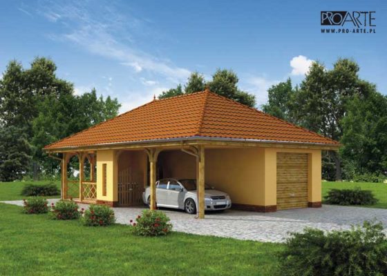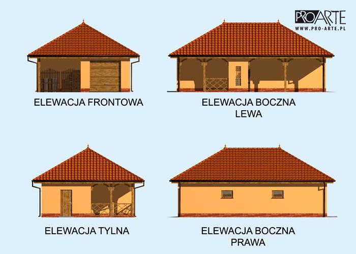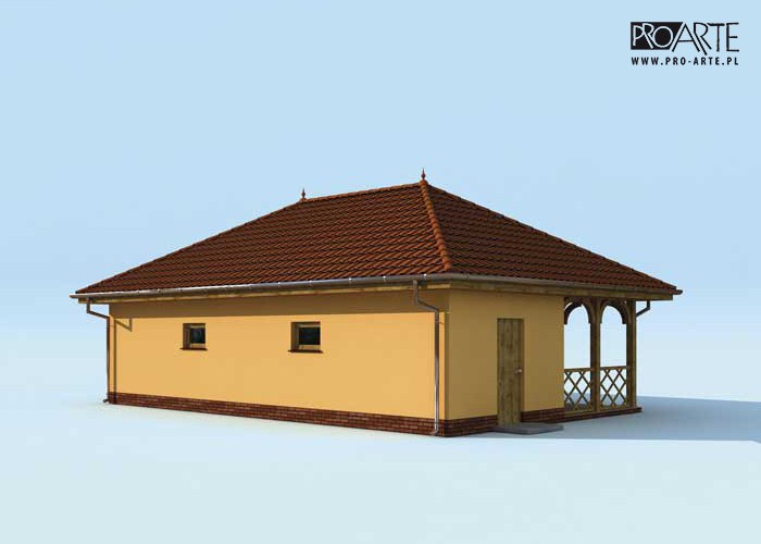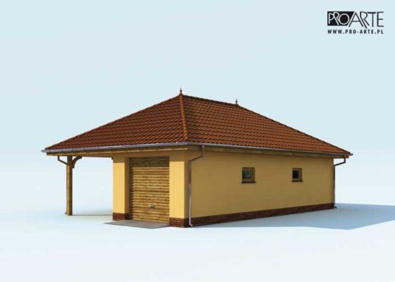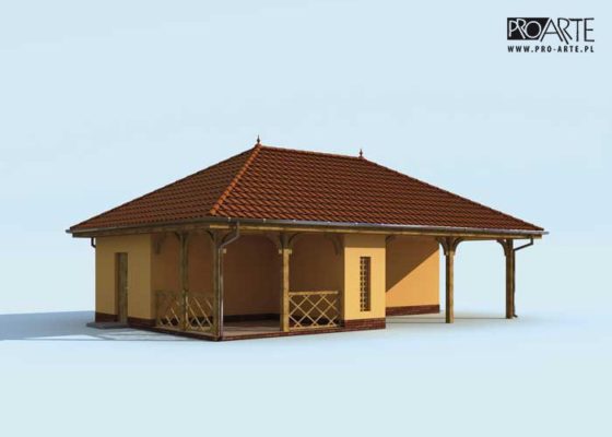 Budynek gospodarczy, wolnostojący. Projekt składa się z części architektonicznej, konstrukcyjnej i wewnętrznej instalacji elektrycznej. W projekcie załączone są podstawowe zestawienie stali, drewna i stolarki okienno-drzwiowej. Do projektu dołączamy bezpłatną zgodę na wprowadzenie zmian, oświadczenie projektantów o wykonaniu projektu zgodnie z obowiązującymi normami i przepisami oraz kserokopie uprawnień projektantów wraz z aktualnym wpisem do izby. W przypadku zamówienia projektu w technologii lekkiej, drewnianej konstrukcji szkieletowej, powierzchnia użytkowa budynku jest o około 7% większa.