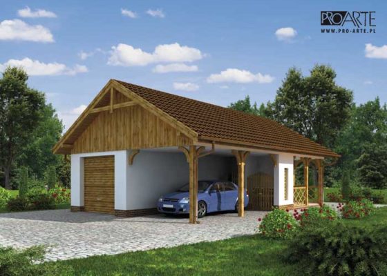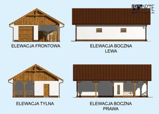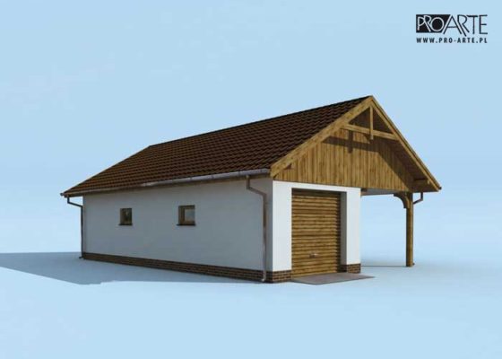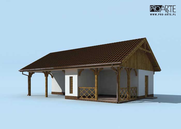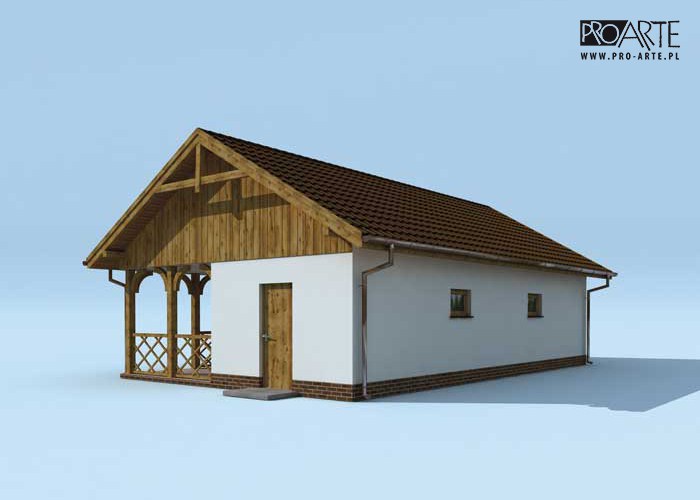 Budynek gospodarczy, wolnostojący. Projekt budynku składa się z 6 egzemplarzy, a w tym 3 tomów części architektoniczno-budowlanejj oraz 3 technicznej. W projekcie załączone są podstawowe zestawienie stali, drewna i stolarki okienno-drzwiowej. Do projektu dołączamy bezpłatną zgodę na wprowadzenie zmian, oświadczenie projektantów o wykonaniu projektu zgodnie z obowiązującymi normami i przepisami oraz kserokopie uprawnień projektantów wraz z aktualnym wpisem do izby.  W przypadku zamówienia projektu w technologii lekkiej, drewnianej konstrukcji szkieletowej, powierzchnia użytkowa budynku jest o około 7% większa.