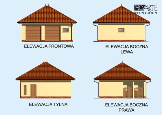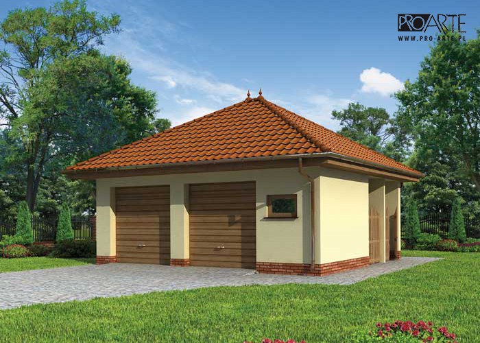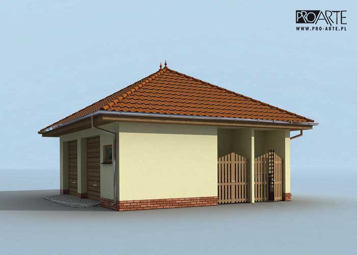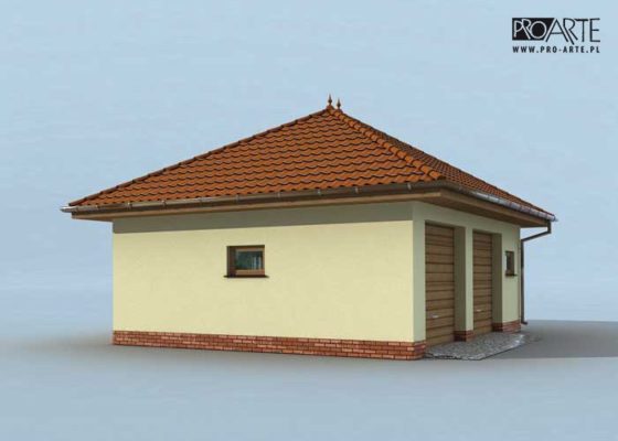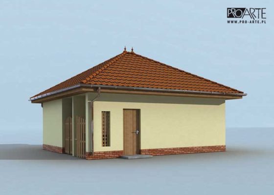 Budynek gospodarczy, wolnostojący. Projekt budynku składa się z 6 egzemplarzy, a w tym 3 tomów części architektoniczno-budowlanej oraz 3 technicznej. W projekcie załączone są podstawowe zestawienie stali, drewna i stolarki okienno-drzwiowej. Do projektu dołączamy bezpłatną zgodę na wprowadzenie zmian, oświadczenie projektantów o wykonaniu projektu zgodnie z obowiązującymi normami i przepisami oraz kserokopie uprawnień projektantów wraz z aktualnym wpisem do izby.  W przypadku zamówienia projektu w technologii lekkiej, drewnianej konstrukcji szkieletowej, powierzchnia użytkowa budynku jest o około 7% większa.