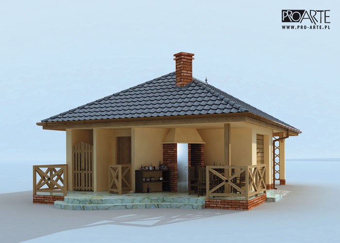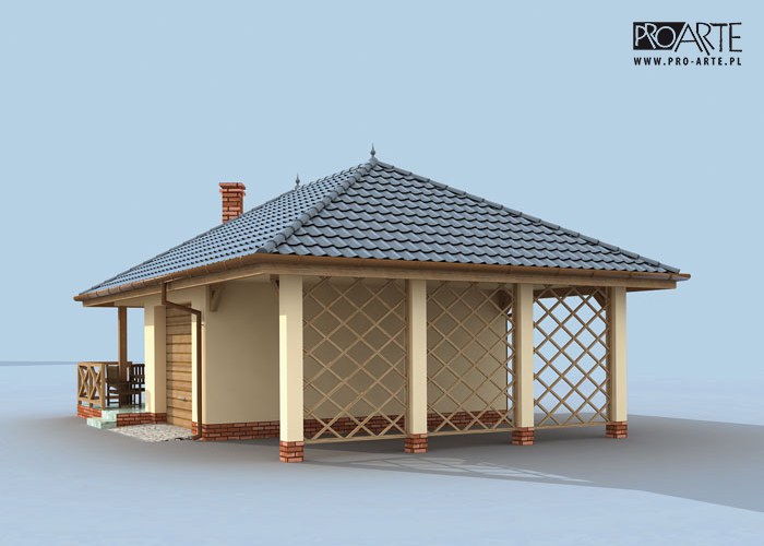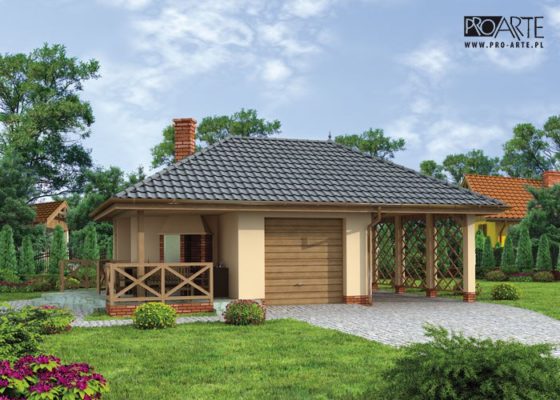 Budynek gospodarczy, wolnostojący. Projekt składa się z części architektonicznej, konstrukcyjnej i wewnętrznej instalacji elektrycznej. W projekcie załączone są podstawowe zestawienie stali, drewna i stolarki okienno-drzwiowej. Do projektu dołączamy bezpłatną zgodę na wprowadzenie zmian, oświadczenie projektantów o wykonaniu projektu zgodnie z obowiązującymi normami i przepisami oraz kserokopie uprawnień projektantów wraz z aktualnym wpisem do izby. W przypadku zamówienia projektu w technologii lekkiej, drewnianej konstrukcji szkieletowej, powierzchnia użytkowa budynku jest o około 7% większa.