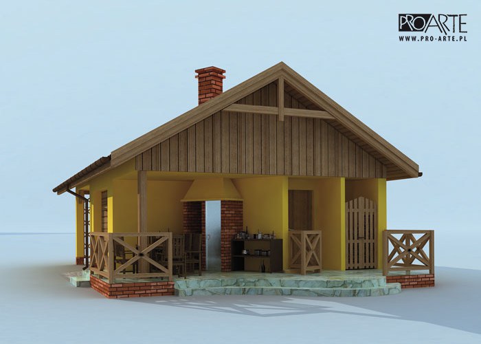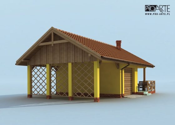 Budynek gospodarczy, wolnostojący. Projekt budynku składa się z 6 egzemplarzy, a w tym 3 tomów części architektoniczno-budowlanej oraz 3 technicznej. W projekcie załączone są podstawowe zestawienie stali, drewna i stolarki okienno-drzwiowej. Do projektu dołączamy bezpłatną zgodę na wprowadzenie zmian, oświadczenie projektantów o wykonaniu projektu zgodnie z obowiązującymi normami i przepisami oraz kserokopie uprawnień projektantów wraz z aktualnym wpisem do izby. W przypadku zamówienia projektu w technologii lekkiej, drewnianej konstrukcji szkieletowej, powierzchnia użytkowa budynku jest o około 7% większa.