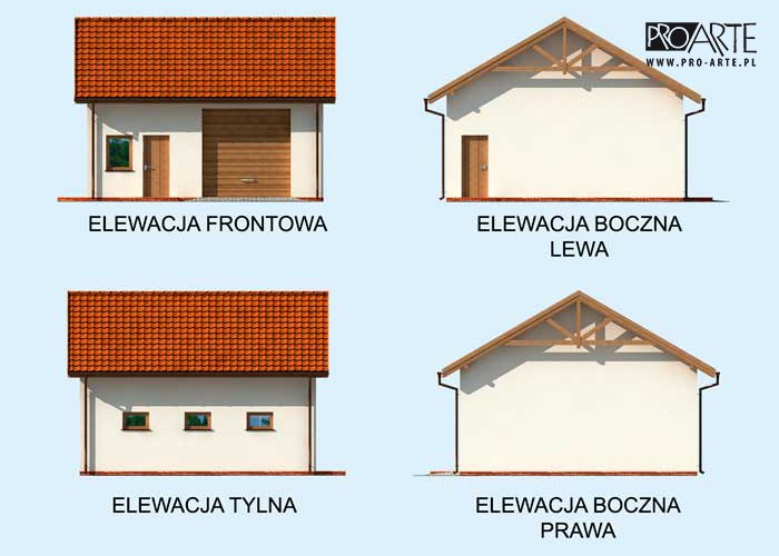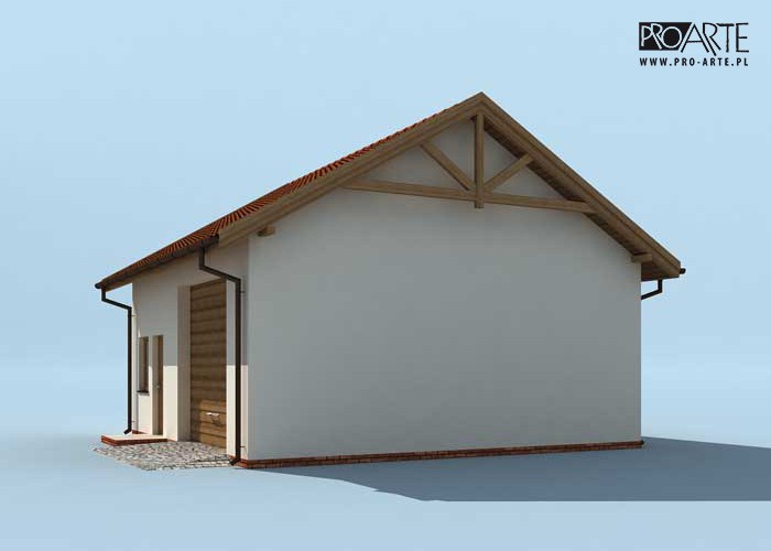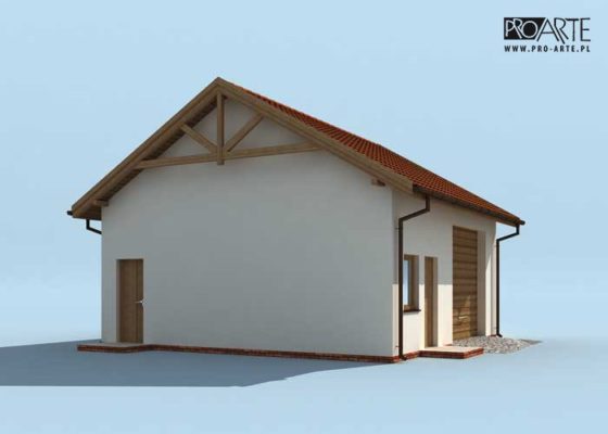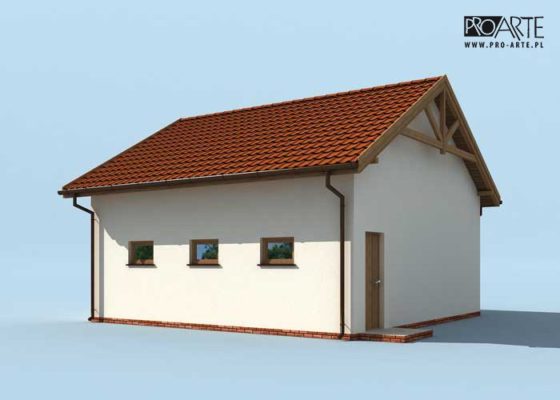Budynek gospodarczy, wolnostojący. Projekt składa się z części architektonicznej, konstrukcyjnej i wewnętrznej instalacji elektrycznej. W projekcie załączone są podstawowe zestawienie stali, drewna i stolarki okienno-drzwiowej. Do projektu dołączamy bezpłatną zgodę na wprowadzenie zmian, oświadczenie projektantów o wykonaniu projektu zgodnie z obowiązującymi normami i przepisami oraz kserokopie uprawnień projektantów wraz z aktualnym wpisem do izby. W przypadku zamówienia projektu w technologii lekkiej, drewnianej konstrukcji szkieletowej, powierzchnia użytkowa budynku jest o około 7% większa.