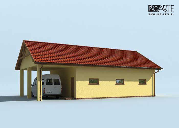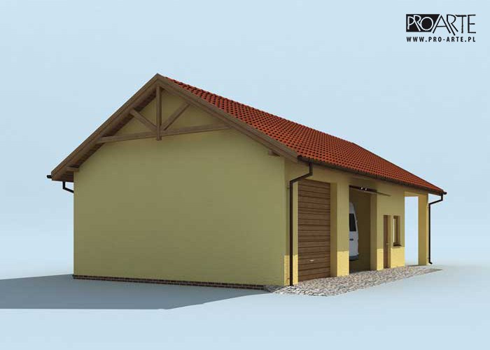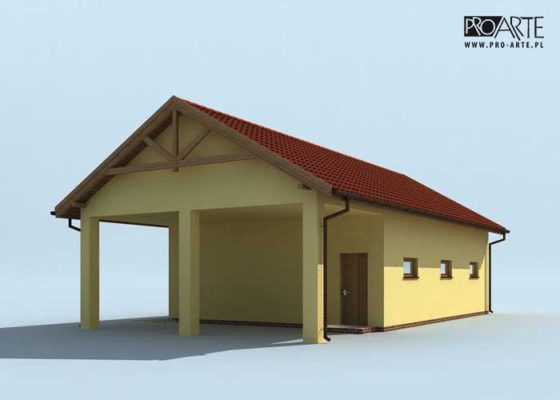 Budynek gospodarczy, wolnostojący. Projekt składa się z części architektonicznej, konstrukcyjnej i wewnętrznej instalacji elektrycznej. W projekcie załączone są podstawowe zestawienie stali, drewna i stolarki okienno-drzwiowej. Do projektu dołączamy bezpłatną zgodę na wprowadzenie zmian, oświadczenie projektantów o wykonaniu projektu zgodnie z obowiązującymi normami i przepisami oraz kserokopie uprawnień projektantów wraz z aktualnym wpisem do izby. W przypadku zamówienia projektu w technologii lekkiej, drewnianej konstrukcji szkieletowej, powierzchnia użytkowa budynku jest o około 7% większa.