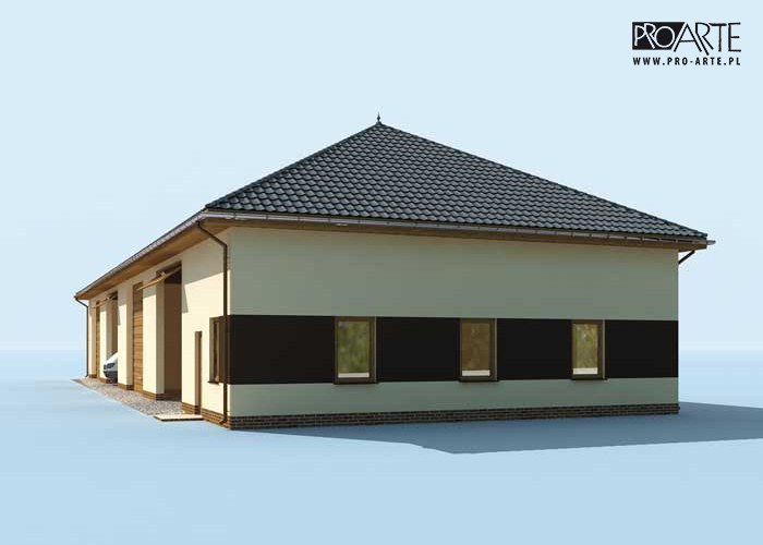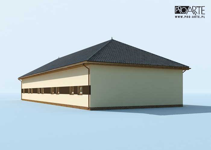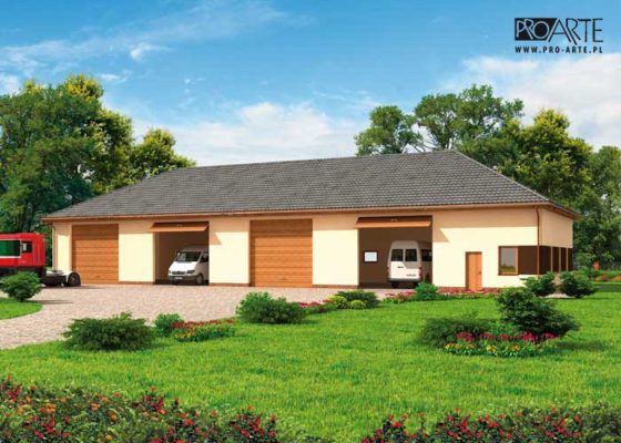Budynek gospodarczy, wolnostojący. Projekt składa się z części architektonicznej, konstrukcyjnej i wewnętrznej instalacji elektrycznej. W projekcie załączone są podstawowe zestawienie stali, drewna i stolarki okienno-drzwiowej. Do projektu dołączamy bezpłatną zgodę na wprowadzenie zmian, oświadczenie projektantów o wykonaniu projektu zgodnie z obowiązującymi normami i przepisami oraz kserokopie uprawnień projektantów wraz z aktualnym wpisem do izby. W przypadku zamówienia projektu w technologii lekkiej, drewnianej konstrukcji szkieletowej, powierzchnia użytkowa budynku jest o około 7% większa.