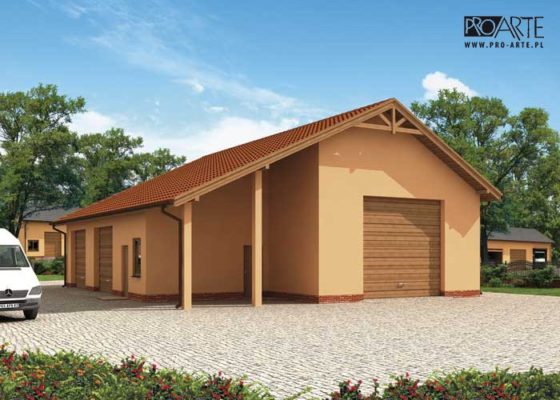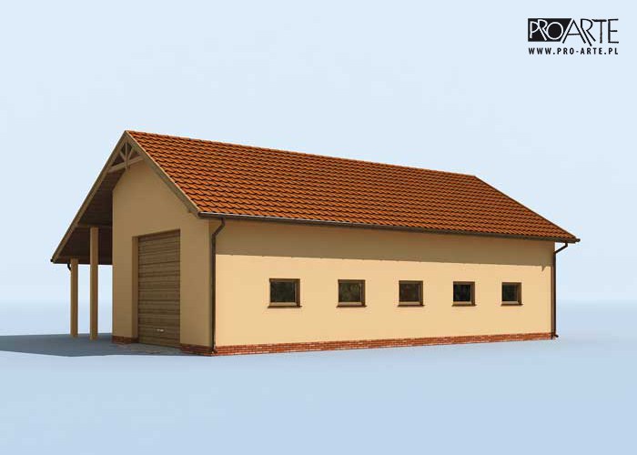 Budynek gospodarczy, wolnostojący. Projekt składa się z części architektonicznej, konstrukcyjnej i wewnętrznej instalacji elektrycznej. W projekcie załączone są podstawowe zestawienie stali, drewna i stolarki okienno-drzwiowej. Do projektu dołączamy bezpłatną zgodę na wprowadzenie zmian, oświadczenie projektantów o wykonaniu projektu zgodnie z obowiązującymi normami i przepisami oraz kserokopie uprawnień projektantów wraz z aktualnym wpisem do izby. W przypadku zamówienia projektu w technologii lekkiej, drewnianej konstrukcji szkieletowej, powierzchnia użytkowa budynku jest o około 7% większa.