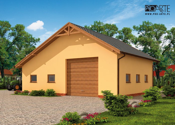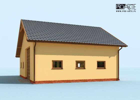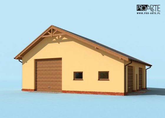 Budynek gospodarczy, wolnostojący. Projekt składa się z części architektonicznej, konstrukcyjnej i wewnętrznej instalacji elektrycznej. W projekcie załączone są podstawowe zestawienie stali, drewna i stolarki okienno-drzwiowej. Do projektu dołączamy bezpłatną zgodę na wprowadzenie zmian, oświadczenie projektantów o wykonaniu projektu zgodnie z obowiązującymi normami i przepisami oraz kserokopie uprawnień projektantów wraz z aktualnym wpisem do izby. W przypadku zamówienia projektu w technologii lekkiej, drewnianej konstrukcji szkieletowej, powierzchnia użytkowa budynku jest o około 7% większa.