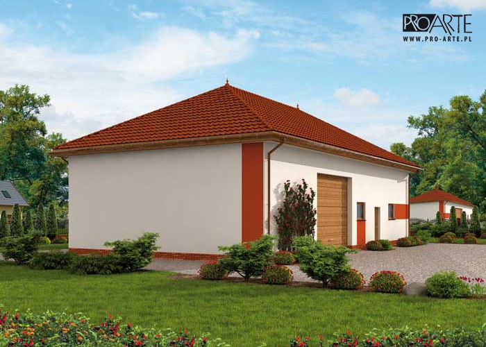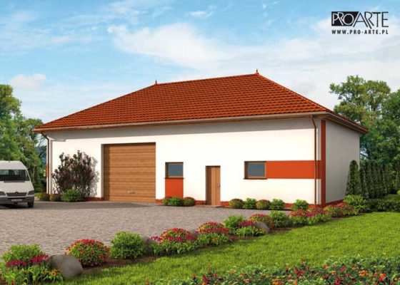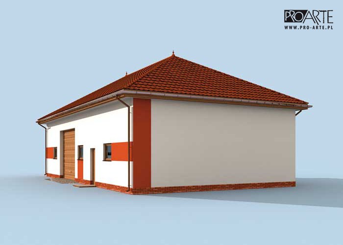 Budynek gospodarczy, wolnostojący. Projekt składa się z części architektonicznej, konstrukcyjnej i wewnętrznej instalacji elektrycznej. W projekcie załączone są podstawowe zestawienie stali, drewna i stolarki okienno-drzwiowej. Do projektu dołączamy bezpłatną zgodę na wprowadzenie zmian, oświadczenie projektantów o wykonaniu projektu zgodnie z obowiązującymi normami i przepisami oraz kserokopie uprawnień projektantów wraz z aktualnym wpisem do izby. W przypadku zamówienia projektu w technologii lekkiej, drewnianej konstrukcji szkieletowej, powierzchnia użytkowa budynku jest o około 7% większa.