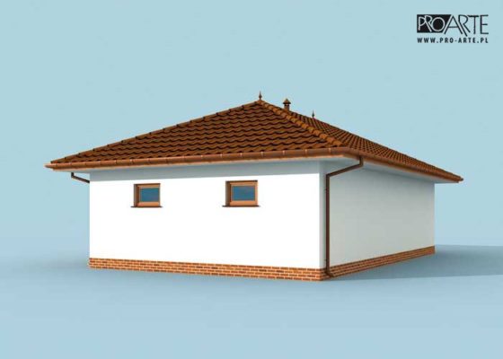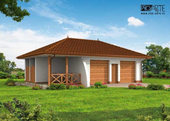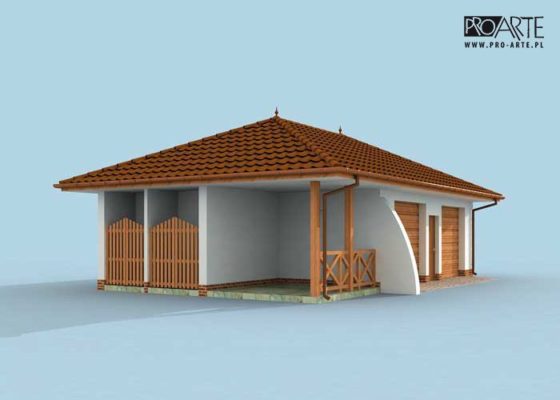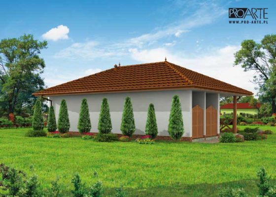 Budynek gospodarczy, wolnostojący. Projekt składa się z części architektonicznej, konstrukcyjnej i wewnętrznej instalacji elektrycznej. W projekcie załączone są podstawowe zestawienie stali, drewna i stolarki okienno-drzwiowej. Do projektu dołączamy bezpłatną zgodę na wprowadzenie zmian, oświadczenie projektantów o wykonaniu projektu zgodnie z obowiązującymi normami i przepisami oraz kserokopie uprawnień projektantów wraz z aktualnym wpisem do izby. W przypadku zamówienia projektu w technologii lekkiej, drewnianej konstrukcji szkieletowej, powierzchnia użytkowa budynku jest o około 7% większa.