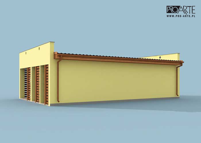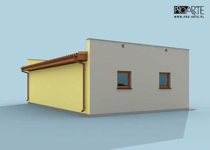 Budynek gospodarczy, wolnostojący. Projekt składa się z części architektonicznej, konstrukcyjnej i wewnętrznej instalacji elektrycznej. W projekcie załączone są podstawowe zestawienie stali, drewna i stolarki okienno-drzwiowej. Do projektu dołączamy bezpłatną zgodę na wprowadzenie zmian, oświadczenie projektantów o wykonaniu projektu zgodnie z obowiązującymi normami i przepisami oraz kserokopie uprawnień projektantów wraz z aktualnym wpisem do izby. W przypadku zamówienia projektu w technologii lekkiej, drewnianej konstrukcji szkieletowej, powierzchnia użytkowa budynku jest o około 7% większa.