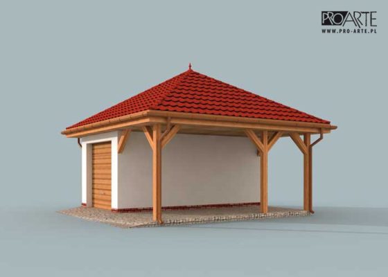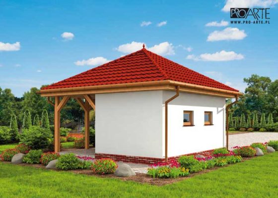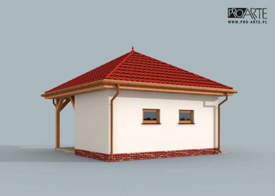 Budynek gospodarczy, wolnostojący. Projekt składa się z części architektonicznej, konstrukcyjnej i wewnętrznej instalacji elektrycznej. W projekcie załączone są podstawowe zestawienie stali, drewna i stolarki okienno-drzwiowej. Do projektu dołączamy bezpłatną zgodę na wprowadzenie zmian, oświadczenie projektantów o wykonaniu projektu zgodnie z obowiązującymi normami i przepisami oraz kserokopie uprawnień projektantów wraz z aktualnym wpisem do izby. W przypadku zamówienia projektu w technologii lekkiej, drewnianej konstrukcji szkieletowej, powierzchnia użytkowa budynku jest o około 7% większa.