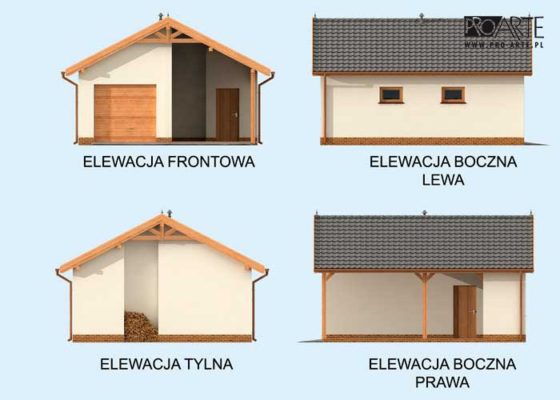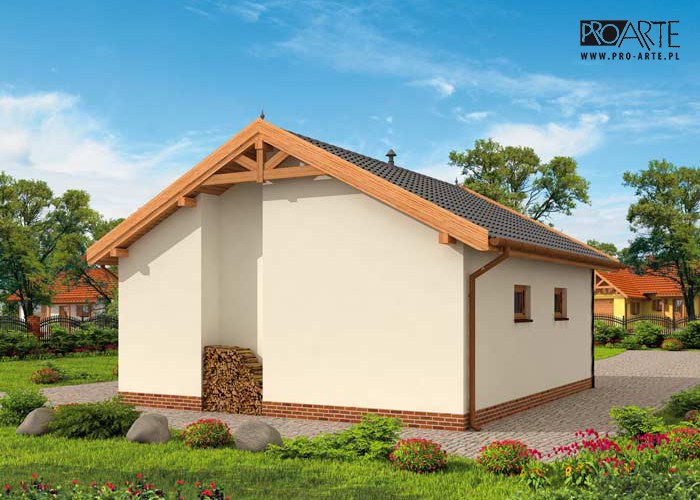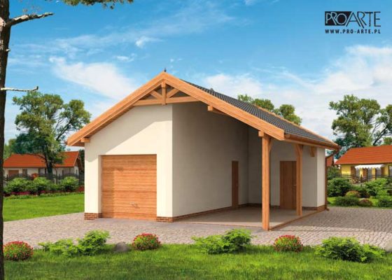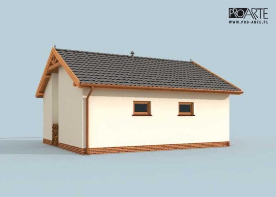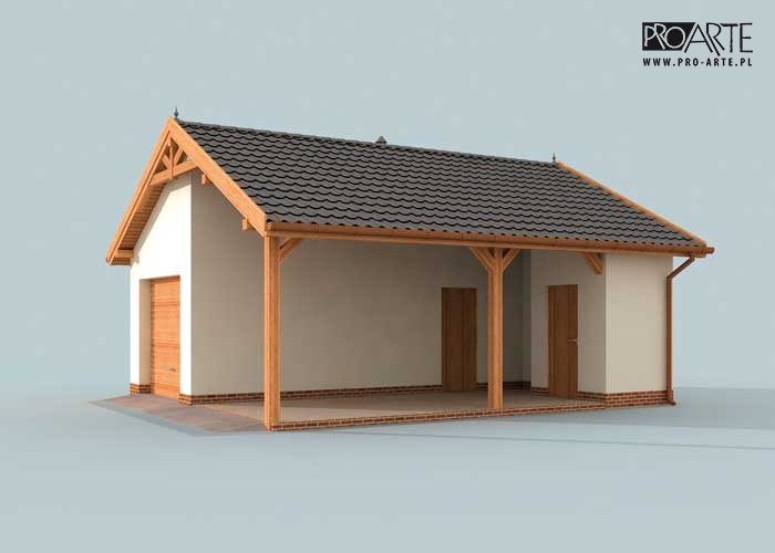 Budynek gospodarczy, wolnostojący. Projekt składa się z części architektonicznej, konstrukcyjnej i wewnętrznej instalacji elektrycznej. W projekcie załączone są podstawowe zestawienie stali, drewna i stolarki okienno-drzwiowej. Do projektu dołączamy bezpłatną zgodę na wprowadzenie zmian, oświadczenie projektantów o wykonaniu projektu zgodnie z obowiązującymi normami i przepisami oraz kserokopie uprawnień projektantów wraz z aktualnym wpisem do izby. W przypadku zamówienia projektu w technologii lekkiej, drewnianej konstrukcji szkieletowej, powierzchnia użytkowa budynku jest o około 7% większa.