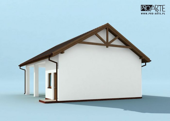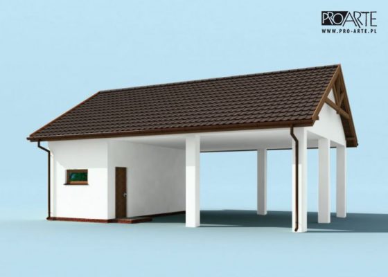 Wiata garażowa dwustanowiskowa z dwoma pomieszczeniami gospodarczymi w technologii szkieletowej, wolnostojący, parterowy.
